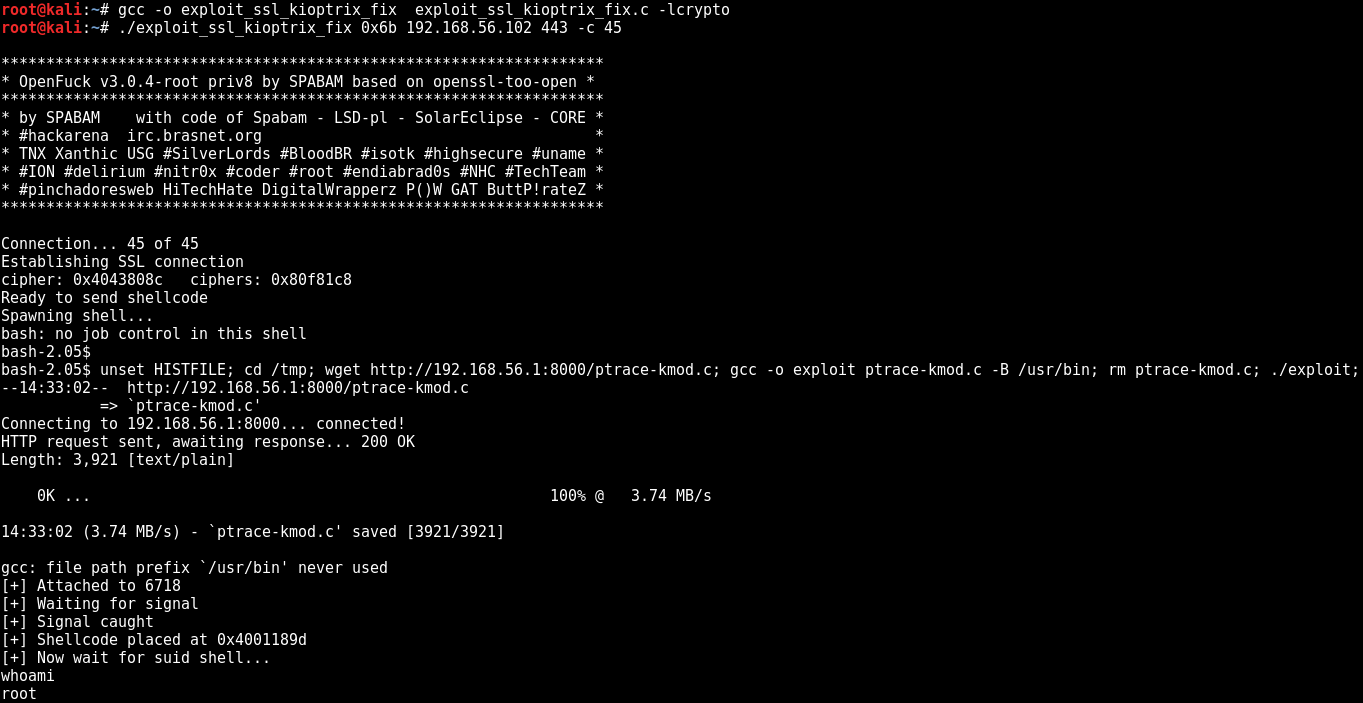 and before installing,you need to install libssl-dev as it is required by the script. Remember the version of apache server is 1.3.20. When you compile the script using : $gcc -o exploit_ssl_kioptrix exploit_ssl_kioptrix.c -lcrypto and execute: $./exploit_ssl_kioptrix