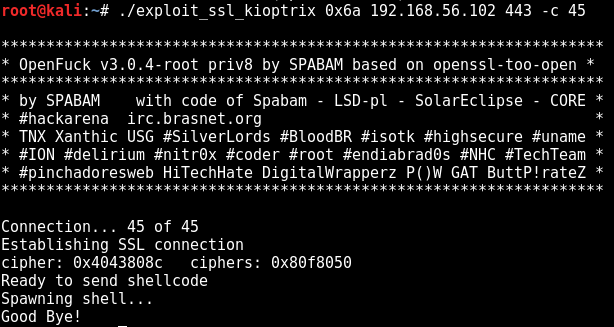 and before installing,you need to install libssl-dev as it is required by the script. Remember the version of apache server is 1.3.20. When you compile the script using : $gcc -o exploit_ssl_kioptrix exploit_ssl_kioptrix.c -lcrypto and execute: $./exploit_ssl_kioptrix